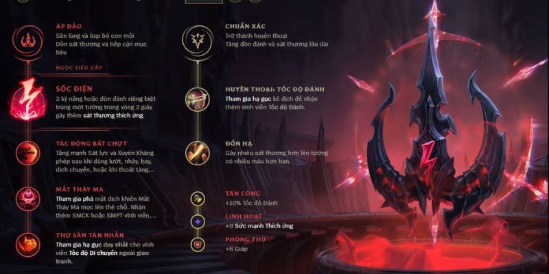 • Chuẩn xác – Trở thành huyền thoại, tăng đòn đánh và sát thương lâu dài: Ngọc siêu cấp – Chinh Phục, Đắc Thắng, Huyền Thoại (Tốc Độ Đánh), Nhát Chém Ân Huệ